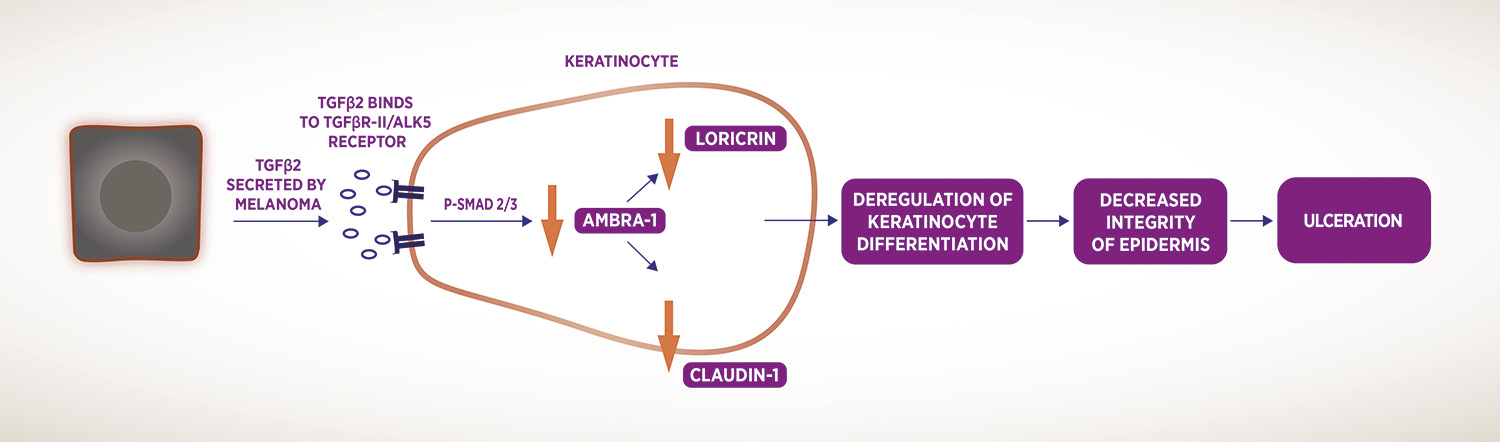 The team at Newcastle University, led by Professor Penny Lovat, in association with AMLo Biosciences have now described the process by which the secretion of TGFβ2 by a primary melanoma causes the reduction, or downregulation, of the proteins AMBRA1 and loricrin in the epidermis overlying the tumour. The growth factor TGFβ2 also causes the loss of claudin-1 leading to loss of the integrity of the skin thereby facilitating tumour ulceration.